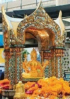 Sindsdien wordt het nogal opzichtige monument overdekt met geurige bloemenkransen, houten olifantjes en andere offergaven, in de hoop op of uit dankbaarheid voor geluk.